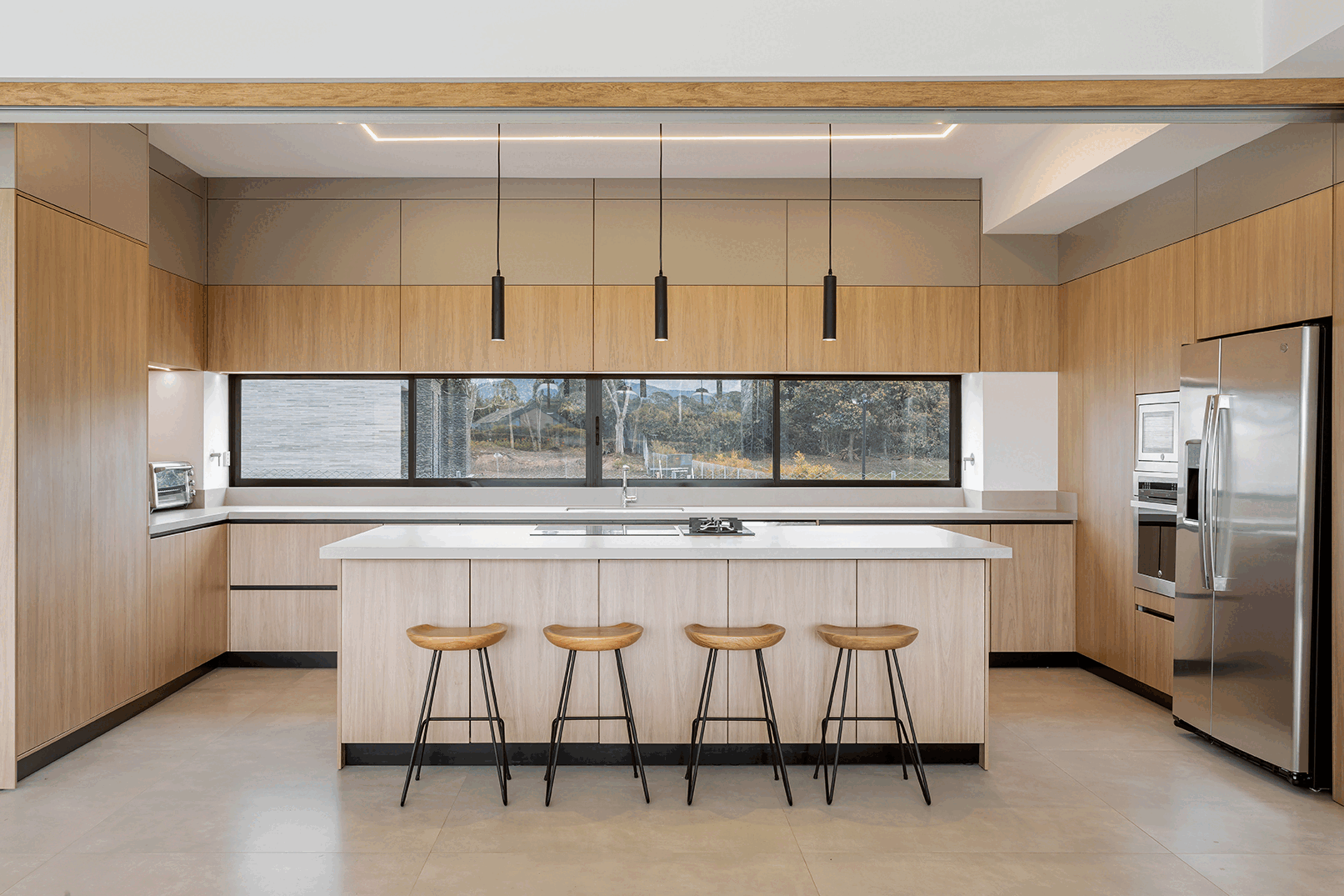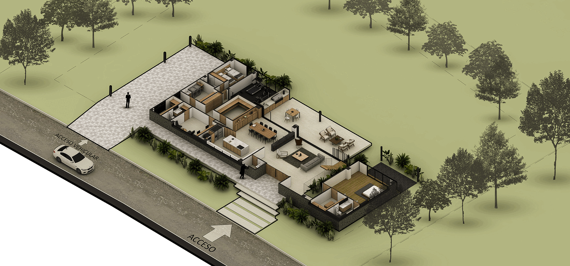 Buscando una relación armoniosa con el lugar, el proyecto trata se adapta al terreno existente con una horizontalidad de dos volúmenes sobrepuestos que dan importancia a la relación visual con el contexto y a una orientación que permita una correcta iluminación y ventilación natural en cada espacio, los cuales se sitúan de forma directa al patio posterior y a su interior alrededor de un jardín, que permite relaciones espaciales por medio de una doble altura en la zona social.